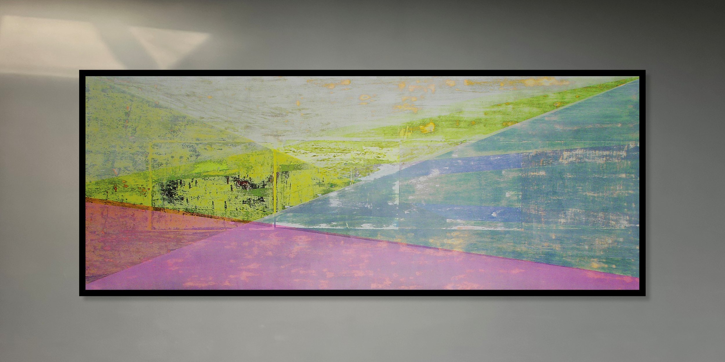 Paint, photography and language, applied, burnished, stripped and reapplied, revealing luminous layers that recede, yet come into focus. Mixed media on hollow core doors. 30" x 80"
