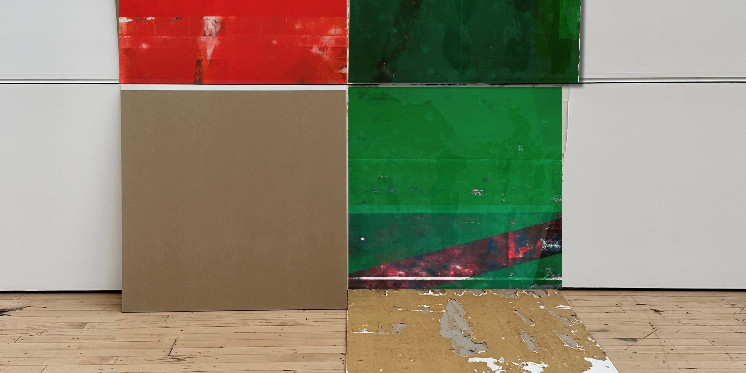 Rejected canvases are covered with monochromatic blocks of color, then sanded back to expose fragments of the original work. A process of covering, revealing, reinvention.